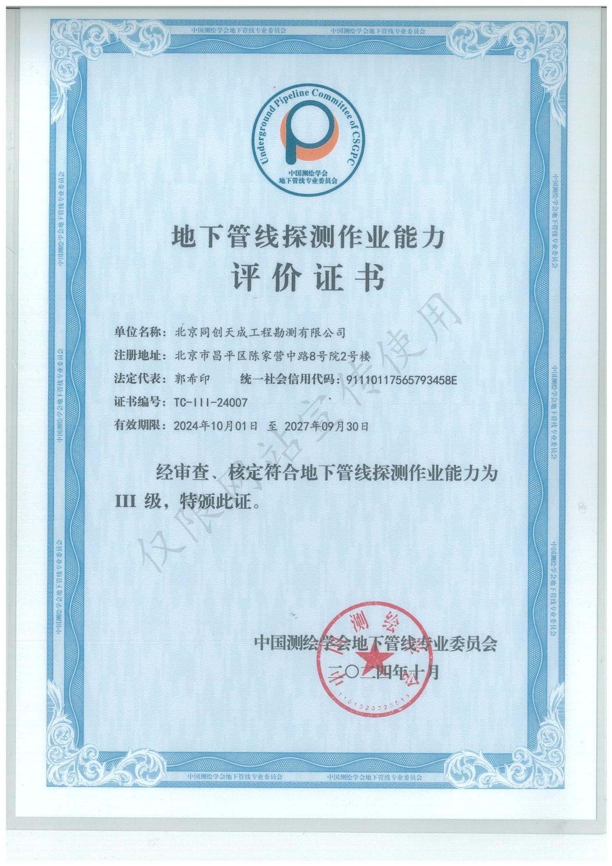 地下管线探测作业能力评价证书